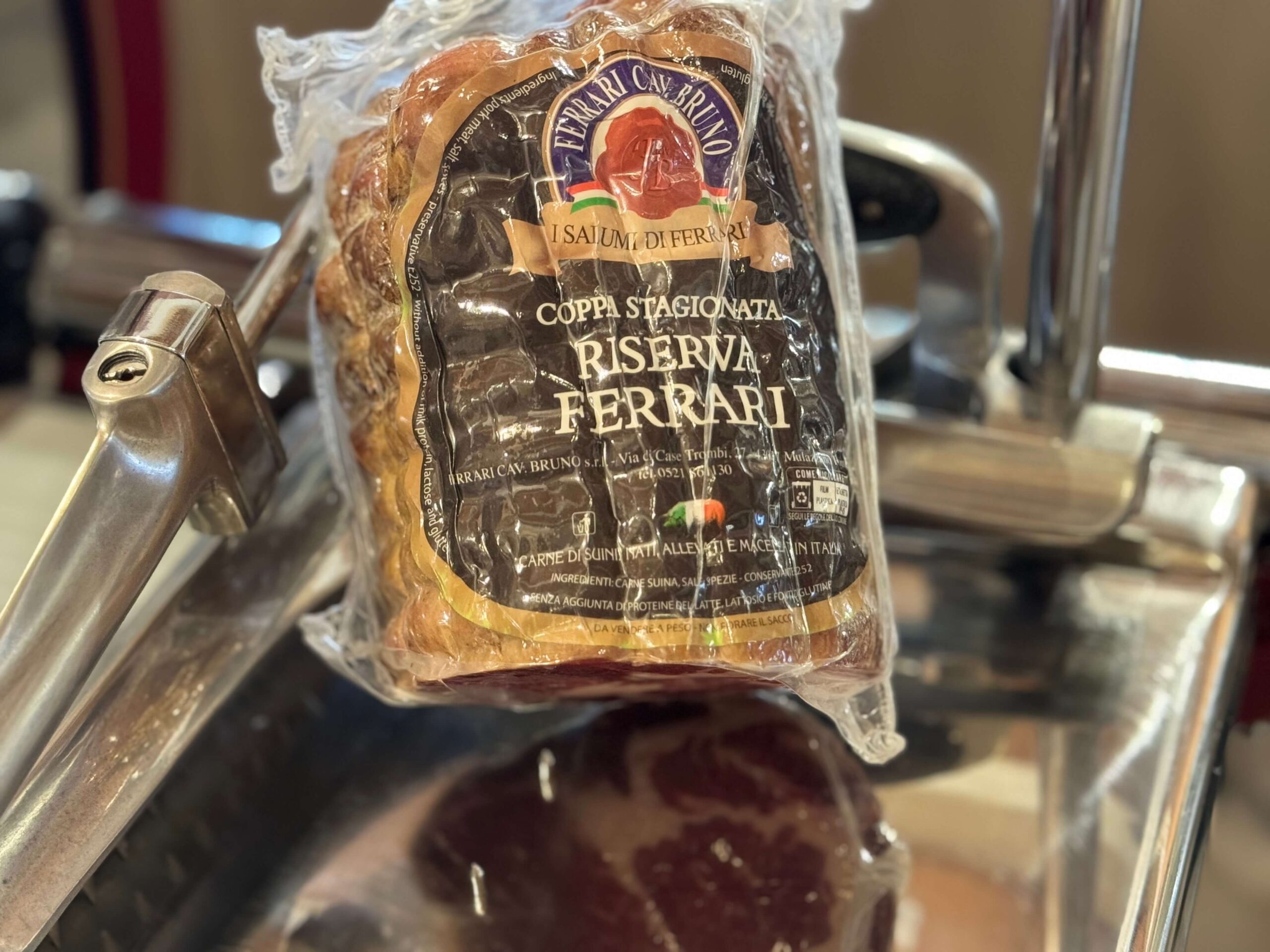 Questa coppa stagionata Riserva Ferrari è del Salumificio Ferrari Cav. Bruno; viene venduta in metà dal peso variabile di circa 1 kg, confezionata sottovuoto, pulita e pronta per essere affettato e gustato nelle tavole dei consumatori più esigenti. E’ prodotta da carni di suini nati, allevati e macellati in Italia e grazie alla lavorazione curata artigianalmente in ogni sua fase, acquisisce un gusto inconfondibile che la rende unica. Profumo delicato, gusto morbido e persistente al palato.